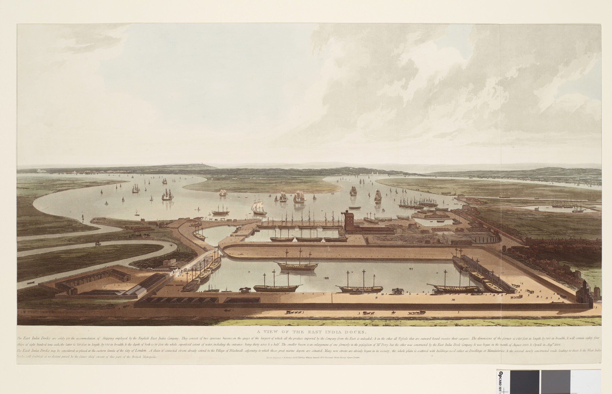 London was the “capital of capital,” and much of this was related to volume of goods moving up the Thames. Shipping required dockage as well as the more mundane work of simply regulating river traffic. Building the East India Docks was a major project, the scale of which this illustration demonstrates. This area has been substantially renovated, some turned into a nature reserve, much into commercial space.