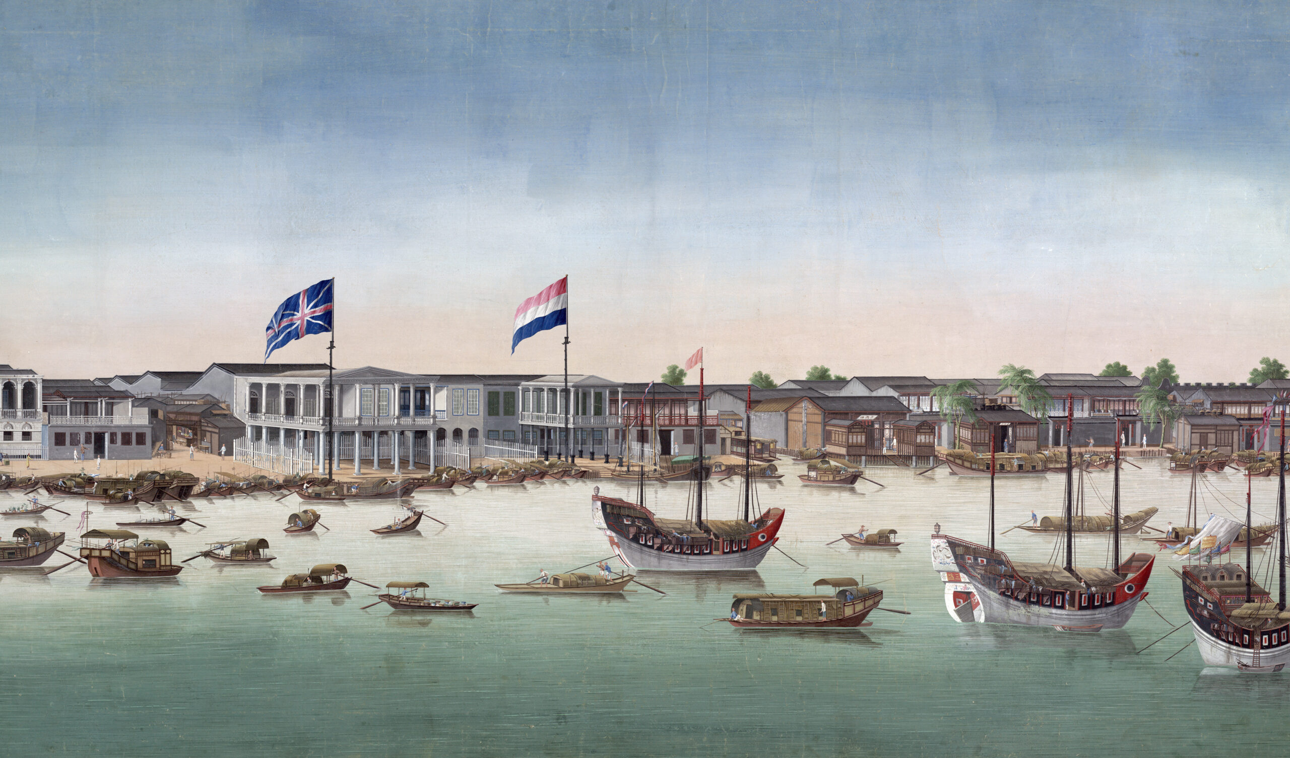 By the middle of the eighteenth century, Canton (Guangzhou) had become the most important port connecting China and the West. Large quantities of goods moved in and out of the city: Chinese tea, silk, porcelain, American silver, and increasingly large amounts of opium, guns, and gunpowder. Ideas also moved back and forth, including Christianity which would influence the founder of Taiping Revolt in the 1800s. A scene of smuggling, corruption, and increasingly tense politics between the Qing Empire and Westerners, Canton emerged as one of the most important places globally in the fractious age of Western imperialism. This illustration depicting Western embassies and Chinese vessels on the Pearl River belies the tumult unfolding in the town and across the Qing Empire.